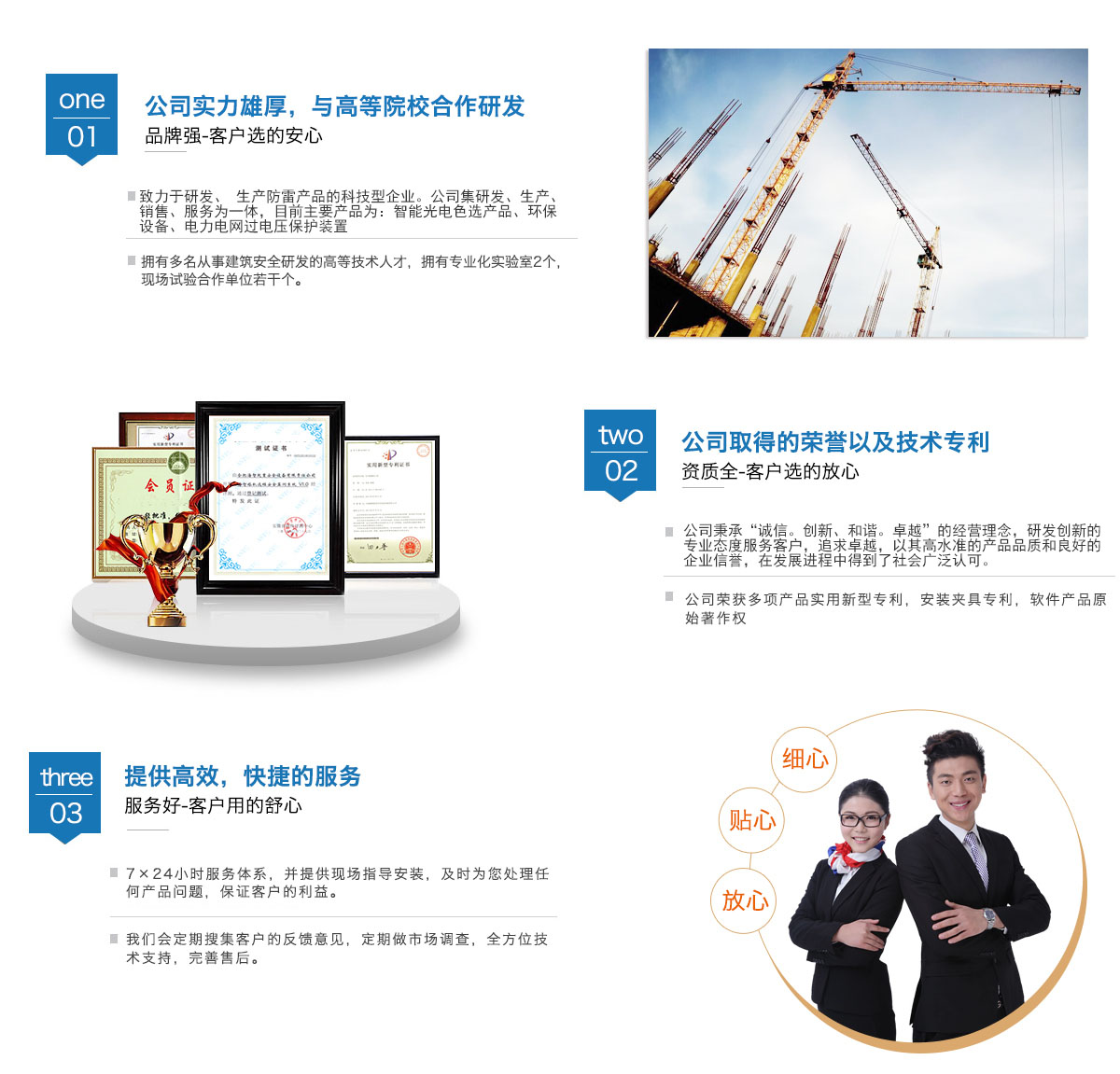 南京通和電氣科技有限公司是致力于研發、 生產防雷產品的科技型企業。公司集研發、生產、銷售、服務為一體,目前主要產品為:智能光電色選產品、環保設備、電力電網過電壓保護裝置。電力成套設備。光電產品、電力監測設備等。公司秉承“誠信。創新、和諧。卓越”的經營理念,研發創新的專業態度服務客戶,追求卓越,以其高水準的產品品質和良好的企業信譽,在發展進程中得到了社會廣泛認可。